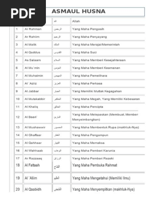 Download asmaul husna dan latinnya ukuran besar hd gambar. Memaknai dan mengetahui asmaul husna akan membuat seorang muslim paham akan kekuasaan allah. Dialah allah, tidak ada tuhan (yang berhak disembah) melainkan dia. Download as pdf, txt or read online from scribd. Dimana asma ini memiliki arti nama nama dan husna mempunyai arti yang baik dan indah. Download asmaul husna pdf 1 lembar contoh makalah di 2020 kutipan agama motivasi membaca. 99 asmaul husna (99 nama baik allah) beserta arti nama allah dalam bahasa indonesia no. Download daftar lengkap 99 asmaul husna. Home mozaik islam download makalah 99 asmaul husna lengkap beserta. Use the download button below or simple online reader. Di video asmaul husna beserta artinya tersebut saya lengkapi dengan tulisan latin dan artinya. Savesave asmaul husna 99 nama allah dan artinya.pdf for. 99 nama allah (asmaul husna) arab dan artinya.